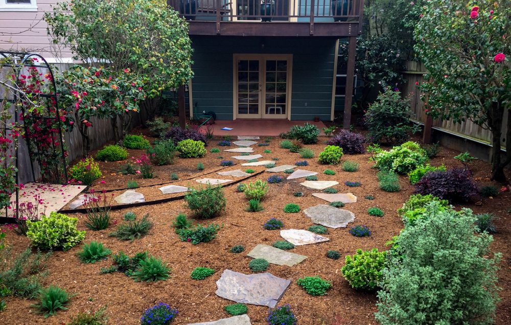 "We LOVE both our finished yard! The guidance and creativity that Bret provided was incredible. We were undecided about what we wanted and he knew exactly what to do. Now we have a lovely, peaceful garden where we love to sit, dine, and read. We even have a small productive veggie garden! We especially appreciated his knowledge of water usage and organic gardening practices!" – Julie G.