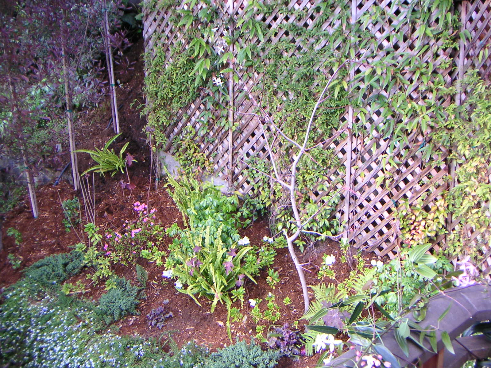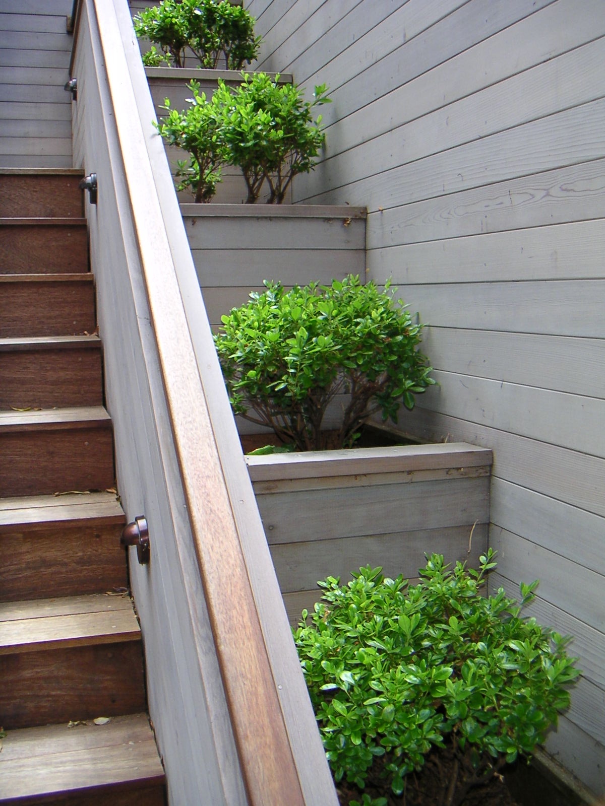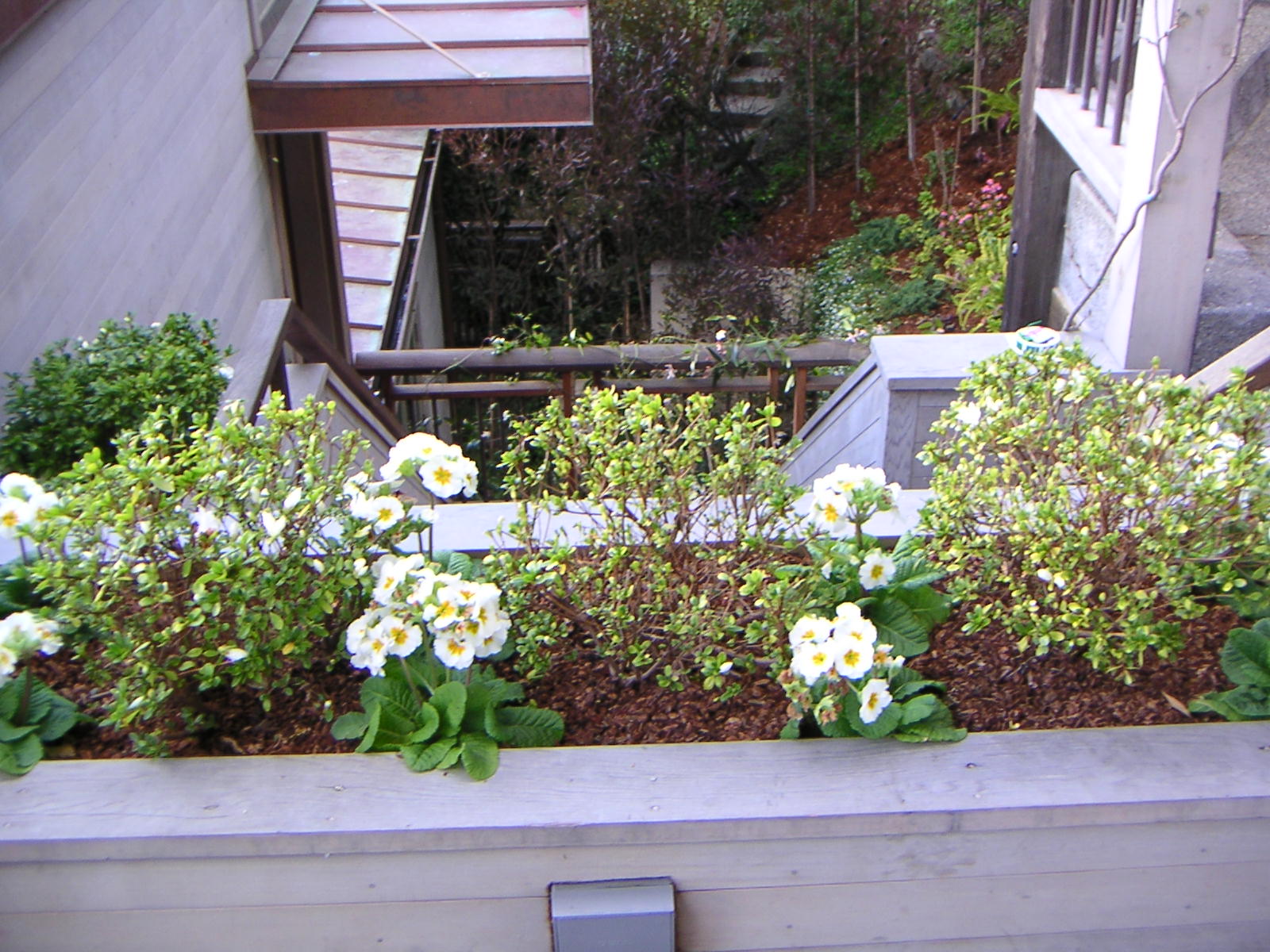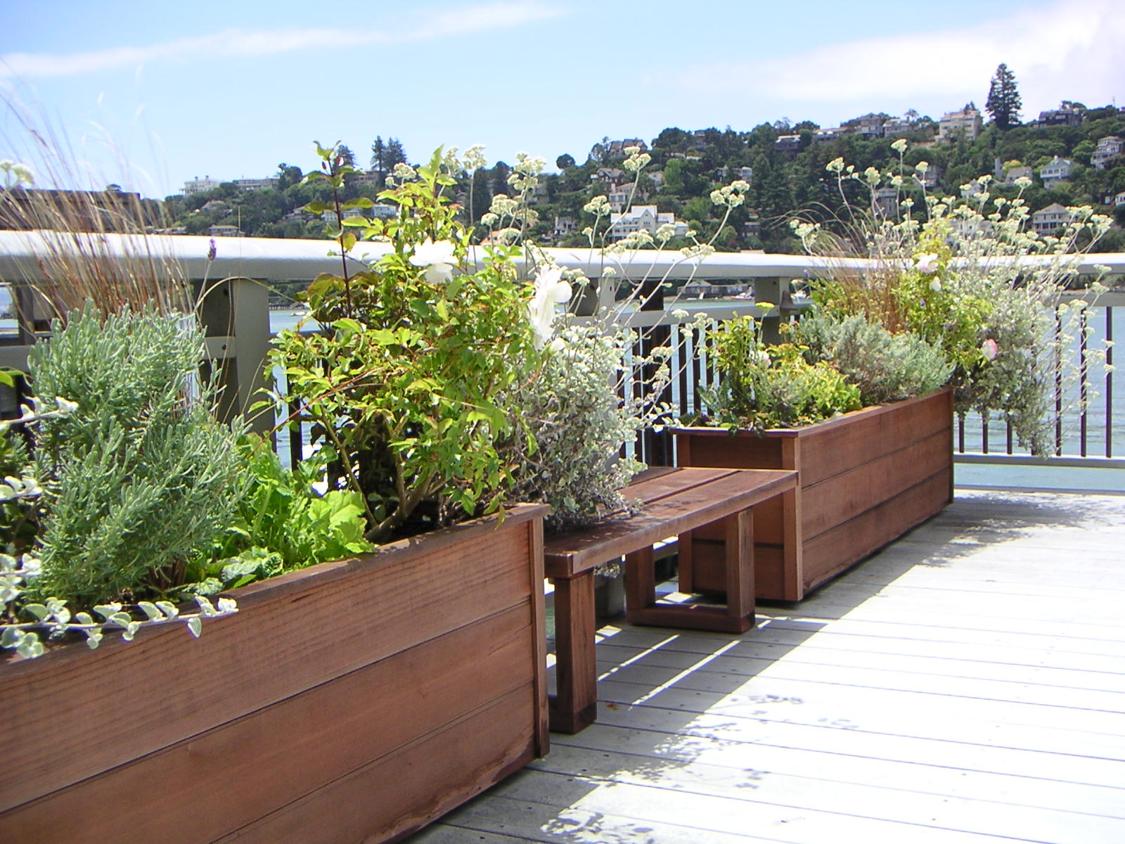 A steep backyard and wood decking provide challenges to a thriving garden. Our solution in the backyard was to grow upward. Retaining walls and trellises let us accomplish that goal, creating a terraced effect. A slab floor helps alleviate dampness underfoot. For the front deck, we built redwood flower boxes and filled them with popping colors to contrast with the deck’s gray hue.